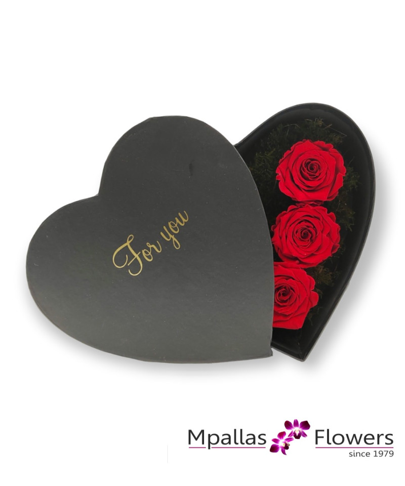 Κουτί πολυτελείας σε σχήμα καρδιάς με 3 Forever Red Roses