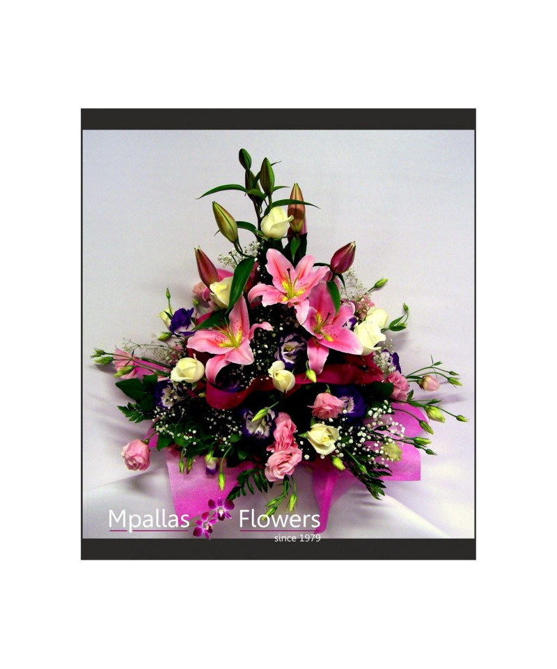 Σύνθεση για νεογέννητο κοριτσάκι ( Λίλιουμ , Τριαντάφυλλα , Λυσίανθοι και διάφορα φυλλώματα )