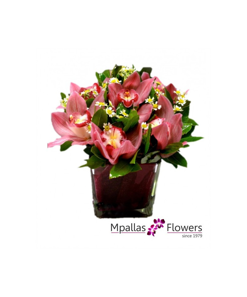 Σύνθεση σε γυάλινο βάζο με φουξ Ορχιδέες Cymbidium