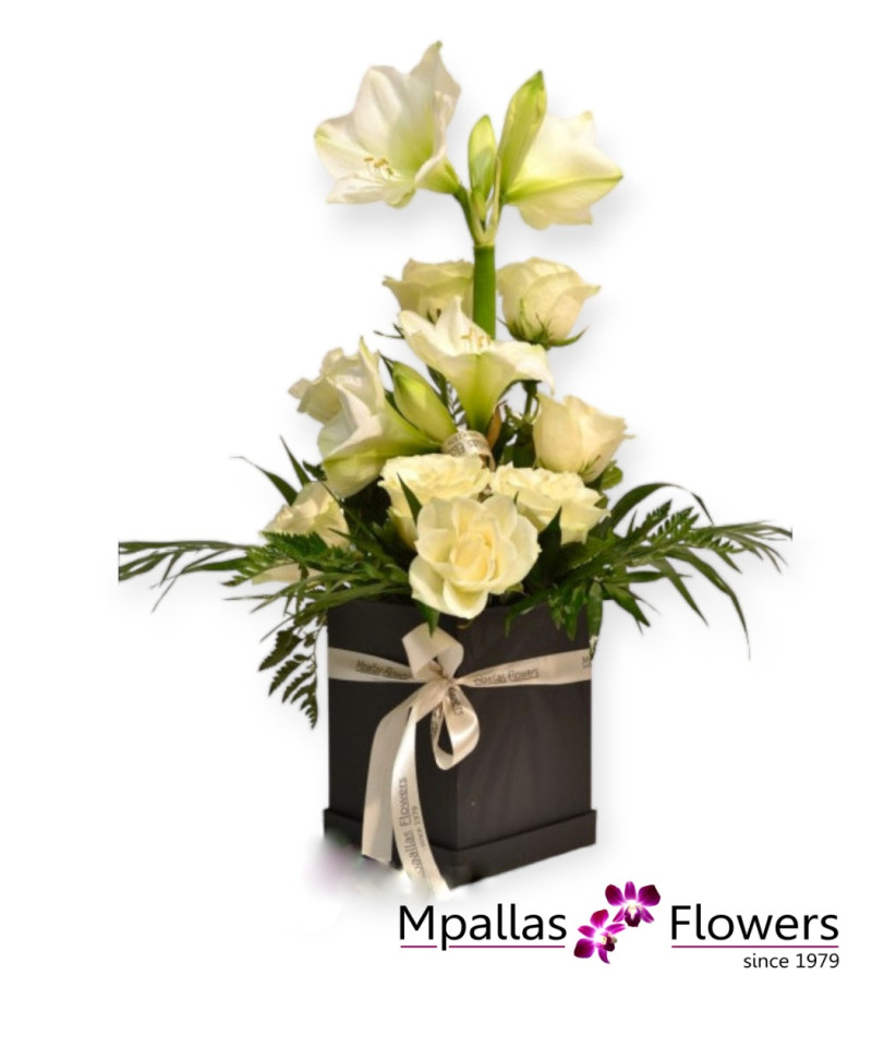 Σύνθεση σε κουτί με Αμαρρυλίς και τριαντάφυλλα σε λευκές αποχρώσεις.