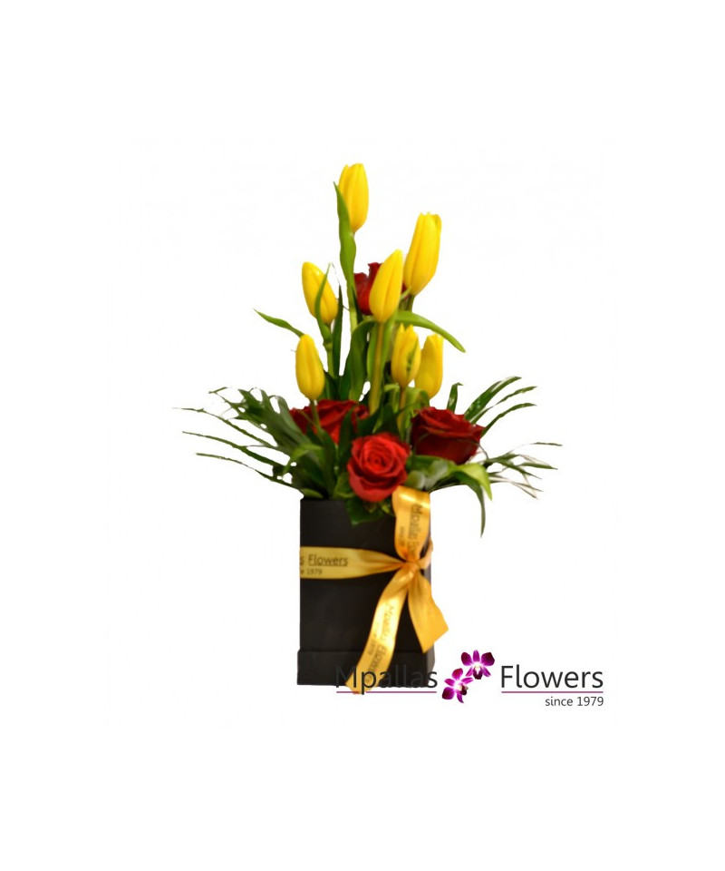 Σύνθεση λουλουδιών σε κουτί με τουλίπες και τριαντάφυλλα με διάφορα φυλλώματα